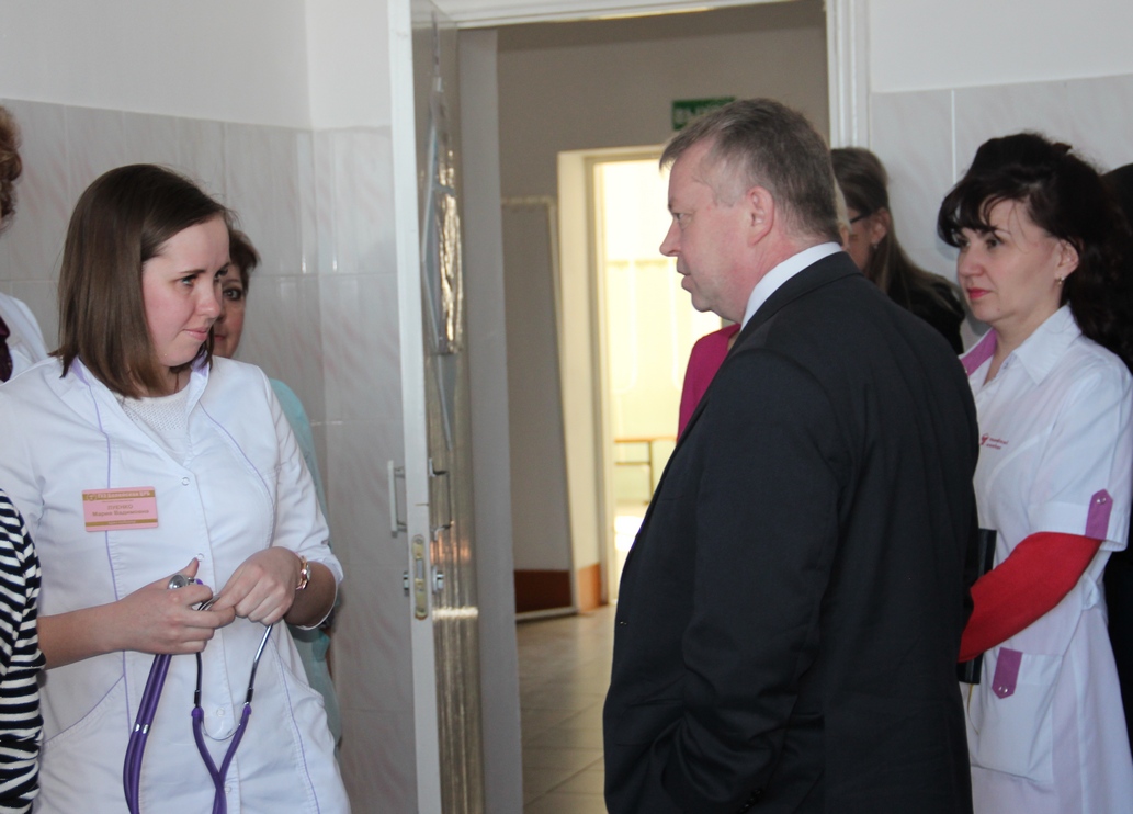 На фото: первый заместитель министра здравоохранения Забайкальского края Иван Шовдра общается с молодым доктором в Балейской ЦРБ.