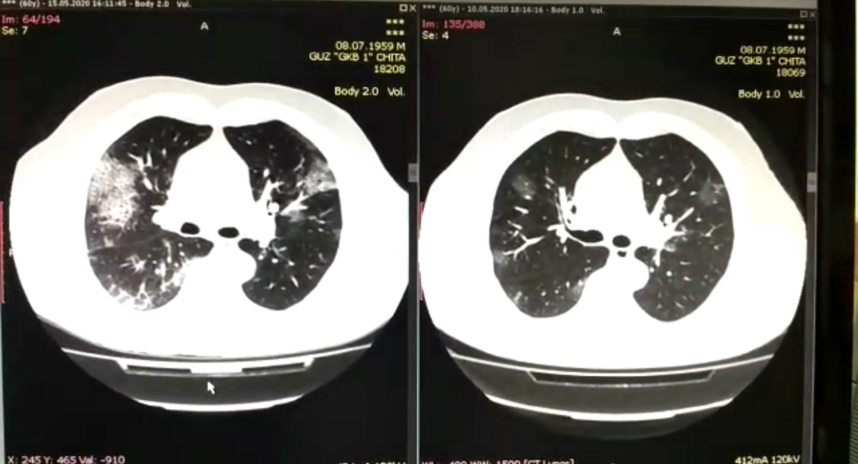 Часть вторая: очаги за несколько дней расползаются до тотальных размеров «Мужчина 60 лет поступает в моностационар. Самочувствие его вполне удовлетворительное. Из симптомов – кашель, высокая температура. Компьютерная томограмма показала начальные признаки поражения лёгких. Мы внимательно наблюдаем за пациентом. Назначаем лечение. Ежедневно оцениваем его состояние. Но на 5-ый день, несмотря на проводимую терапию, еле видимые участки "расползлись" до больших размеров и лёгкие тотально поражены», - рассказывает доктор.