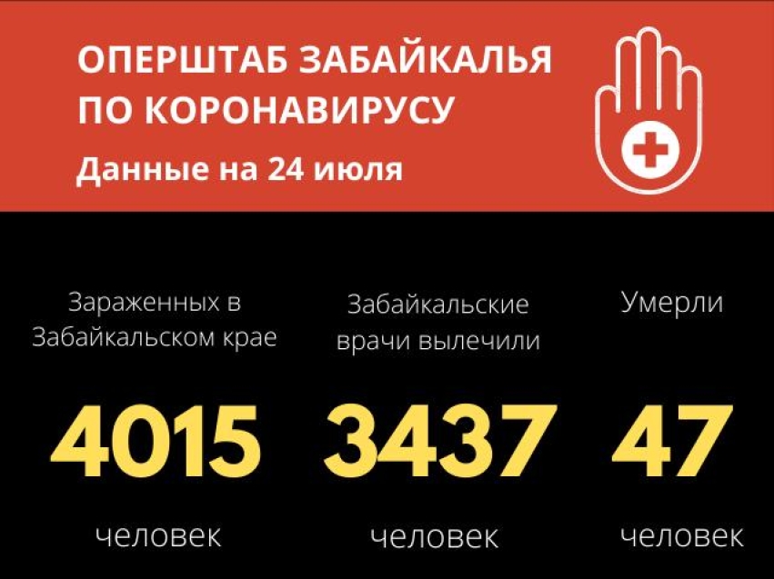 По данным на 24 июля, в Забайкальском крае число случаев заражения коронавирусной инфекцией достигло 4015 (13 за последние сутки). Из них 3437 (41 за сутки) человек вылечены и выписаны из медицинских учреждений. Новых летальных случаев от вируса не зарегистрировано.