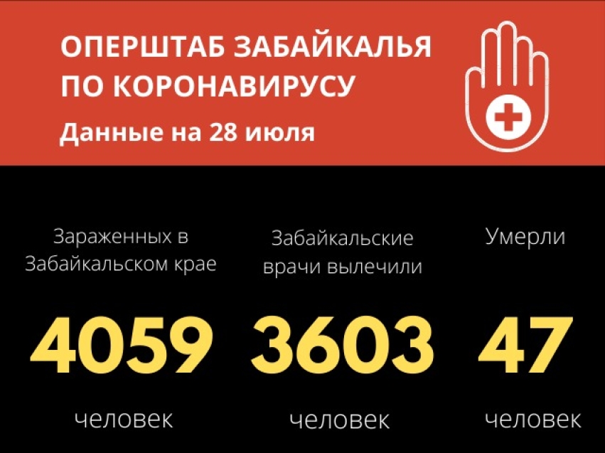 По данным на 28 июля, в Забайкальском крае число случаев заражения коронавирусной инфекцией достигло 4059 (9 за последние сутки). Из них 3603 (87 за сутки) человек вылечены и выписаны из медицинских учреждений. Новых летальных случаев от вируса не зарегистрировано.