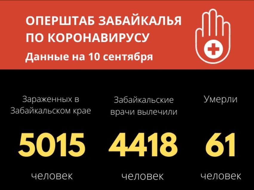 По данным на 10 сентября, в Забайкальском крае число случаев заражения коронавирусной инфекцией достигло 5015 (48 за последние сутки). Из них 4418 (7 за сутки) человек вылечены и выписаны из медицинских учреждений. Общее количество летальных случаев – 61.