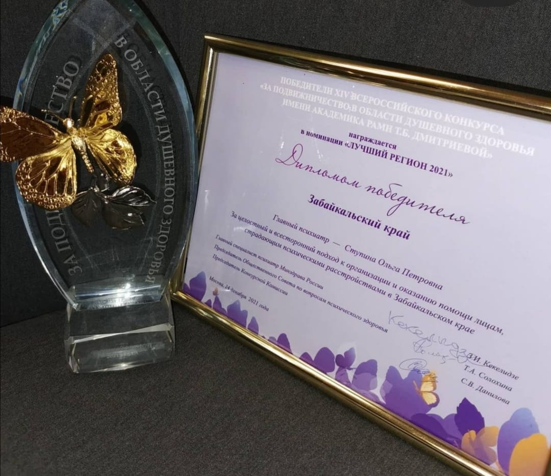 Психиатрическая служба Забайкальского края признана лучшей на ХIV Всероссийском конкурсе «За подвижничество в области душевного здоровья» имени академика РАМН Т. Б. Дмитриевой среди коллективов психиатрических и наркологических учреждений, центров психосоциальной реабилитации, некоммерческих организаций из всех регионов России.
