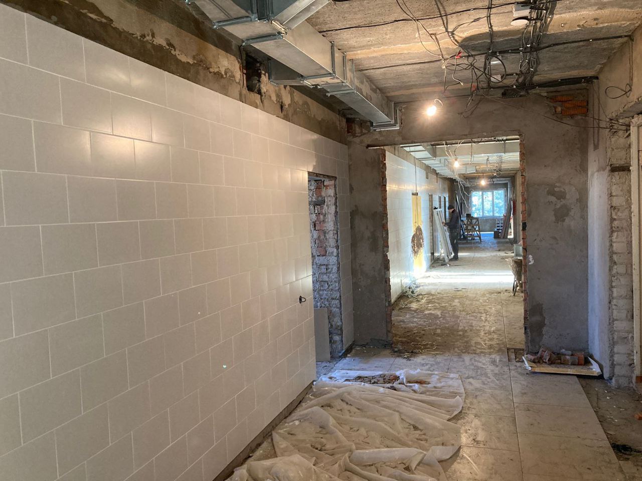 В коридорах и кабинетах поликлинического подразделения укладывают напольное покрытие одного уровня для беспрепятственного доступа лиц с ограниченными возможностями. В кабинетах стоматолога подводят коммуникации для подключения стоматологических кресел. Также продолжаются работы по отделке помещений поликлинического подразделения и ремонт вентиляционной системы на техническом этаже здания.