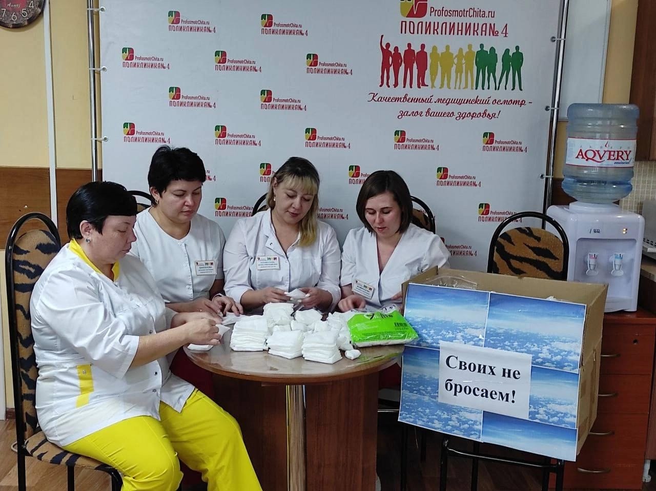 Коллектив городской поликлиники №4 города Читы присоединился к акции «Забайкальцы - медикам Донбасса!». Сотрудники медицинского учреждения передали перевязочный материал в госпитали, которые помогают участвующим в СВО.